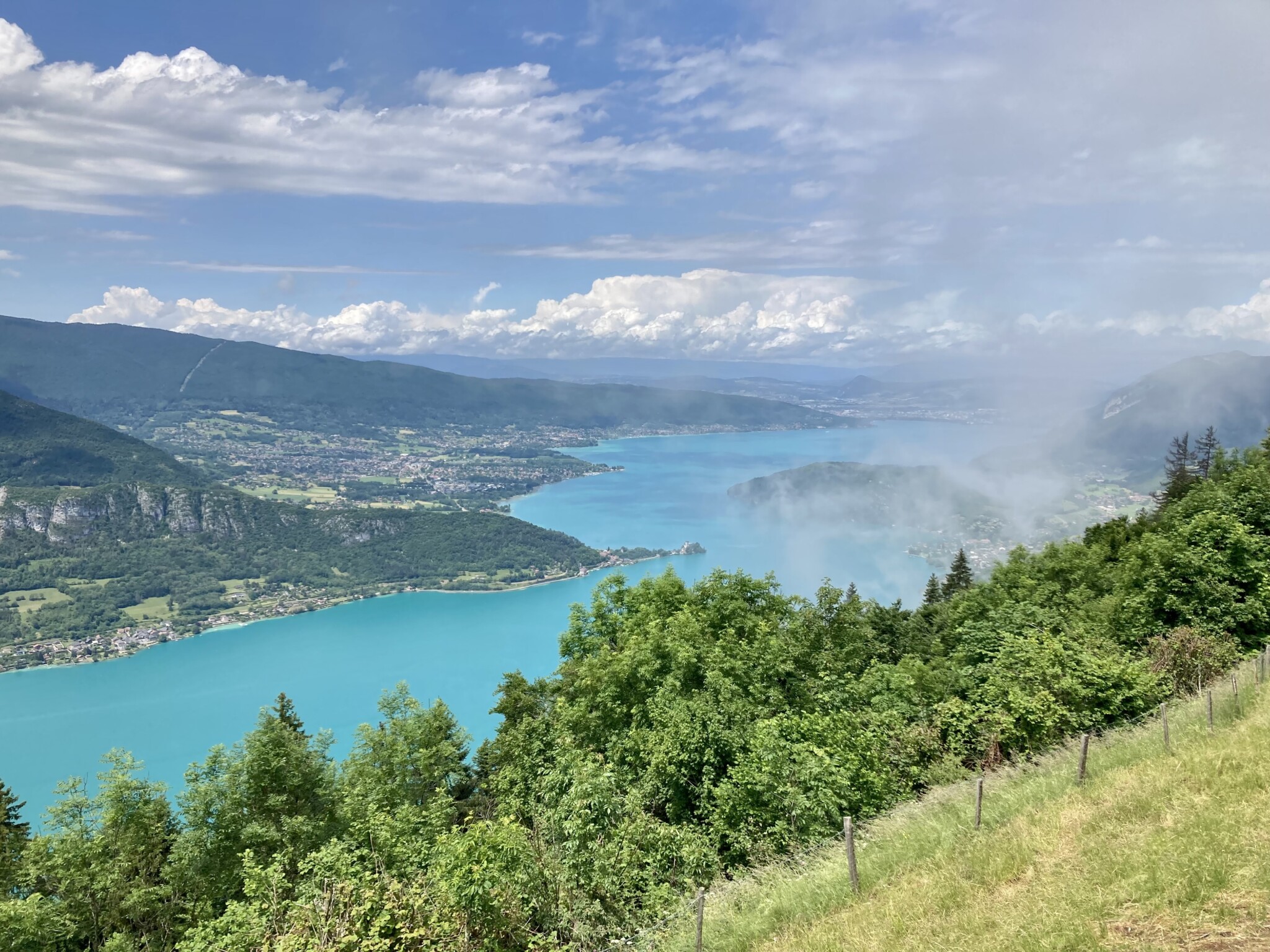 Annecy Gölü beni neden bu kadar etkiledi diye soruyorum uzun zamandır. Sanırım en büyük sebep, manzarası. Aşağıda gördüğün manzara, birçok noktadan sadece bir tanesi. Vue sur le lac d’annecy diye aratabileceğin bu alanda oturmak gerçekten çok keyifli. Sabah vakitlerinde paraşütle uçmak da mümkün. Hemen arkası ise harika bir dağ manzarasına ev sahipliği yapıyor. Manzaraya en hakim tepede de bir kafe mevcut. Park yeri de yeterli ama buraya gelirken yol kenarında başka yerlerde de durmak ve manzaranın tadını çıkarmak isteyeceksin.